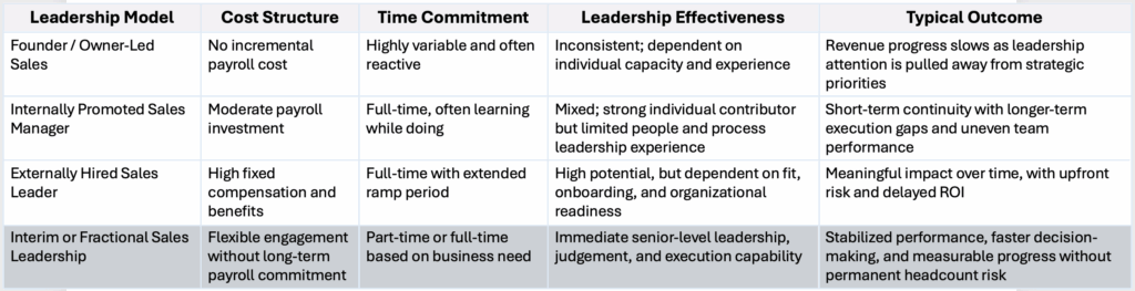 The matrix below illustrates the most common sales leadership models, the risks inherent in each, and where fractional versus interim leadership delivers the highest return based on scope, urgency, and organizational complexity.